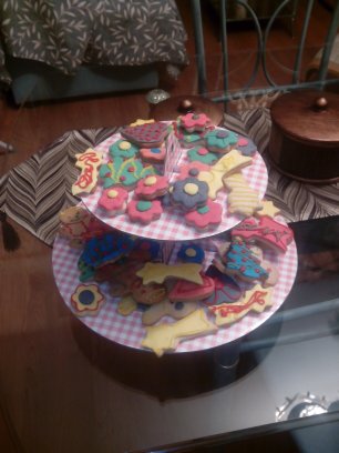 * En este caso las galletas las hemos decorado con pasta fondant comprada en paquetes y con los colores ya hechos, aún así puedes conseguir colores mezclando distintos fondant. Para conseguir las formas lo que hacemos es extender el fondant y cortar con el mismo cortapastas de las galletas la forma deseada. Después mojas con unas gotas de agua la galleta y pegas el fondant presionando un poco. ¡ Y listo !
