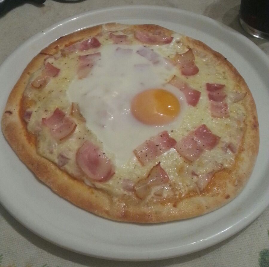 • Una vez realizada la salsa carbonara, la añadimos a la base de pizza junto con las tiras de baicon. Agregamos un poco de queso para gratinar (al gusto de cada uno) y el huevo. Y pasados los minutos, a degustar esta sencilla receta!