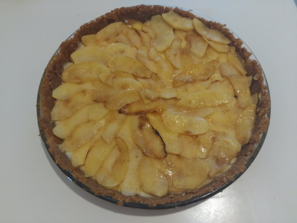 - Por otro lado, pelamos y troceamos las manzanas y las hacemos a la plancha con un poco de mantequilla para evitar que se peguen. Después las colocamos sobre las natillas de forma que quede toda la capa cubierta.