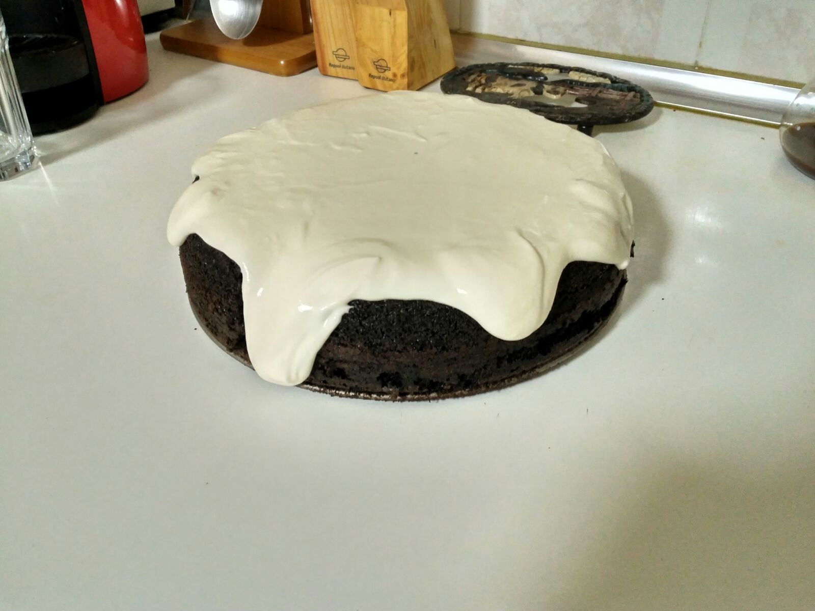 - A continuacion lo ponemos en nuestra tarta dejando caer un poco por los bordes o si todavia el bizcocho no está frio lo conservaremos en la nevera en el bol bien tapado hasta que lo vayamos a usar para decorar y ¡listo!