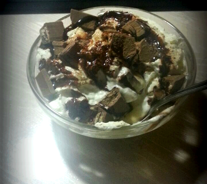 - Por último, los trozos restantes de la tableta de KitKat los pondremos por encima y decoramos el postre con sirope de chocolate (a gusto propio) y espolvoreamos el cacao